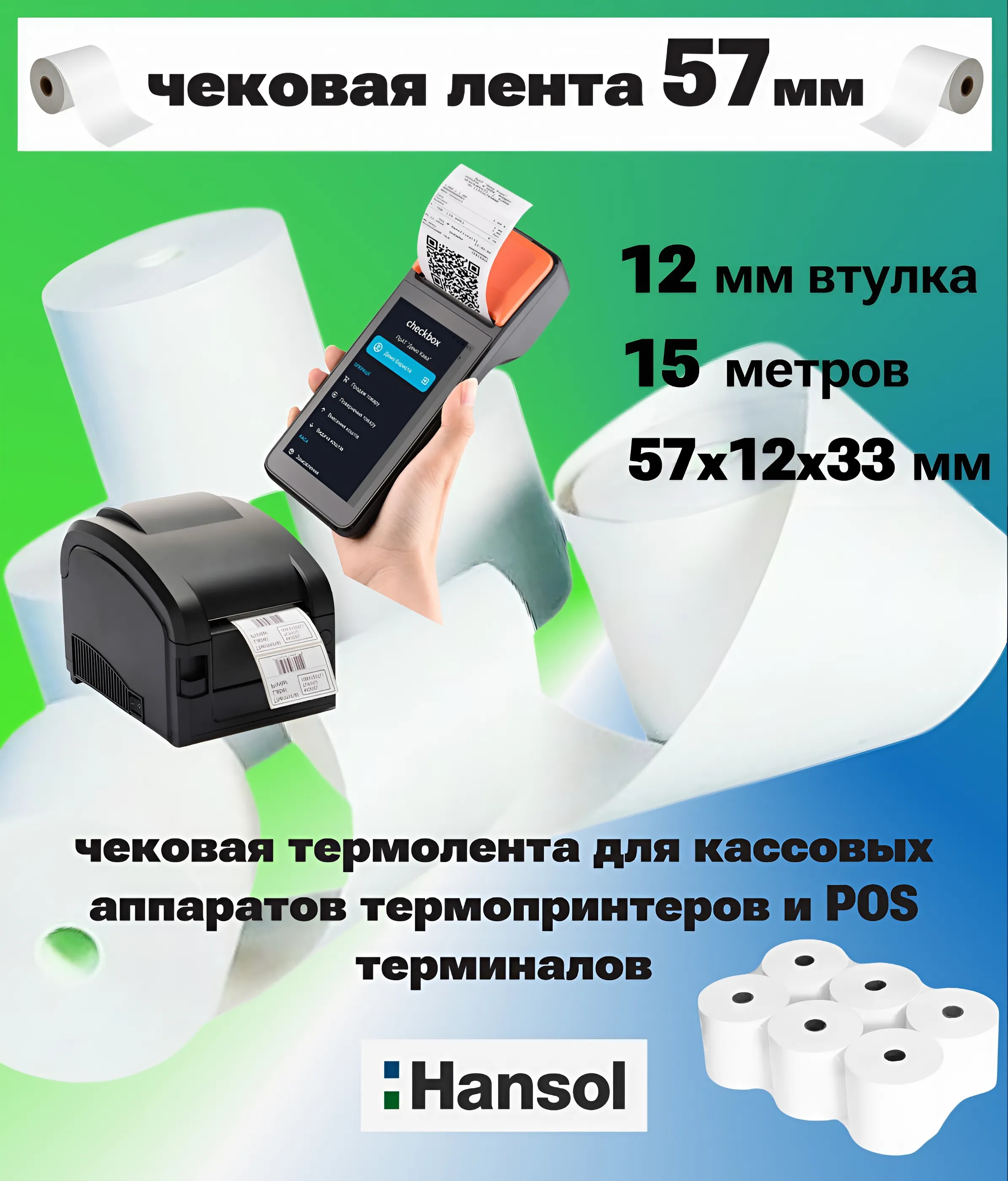 Чековая термолента ширина 57мм, длина 15м. Лента для кассовых аппаратов, изготовленная из термочувствительной бумаги Hansol, отличается высоким качеством и надёжностью. Она позволяет получать чёткие и долговечные отпечатки на любых кассовых аппаратах с термопринтерами. Ширина ленты составляет 57 мм, а диаметр втулки — 12 мм. Это оптимальные параметры для большинства терминалов и печатающих устройств. Использование высококачественной термобумаги Hansol гарантирует сохранность информации на протяжении длительного времени при условии правильного хранения вдали от влаги и прямых солнечных лучей. Ширина ленты 57мм, длина 15м, втулка 12мм.