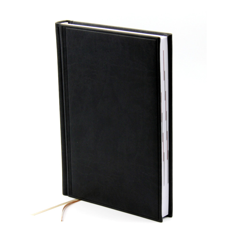 Ежедневник недатированный формата А5, черный. Одна страница – один рабочий день, суббота и воскресенье на одной странице, русский язык, дополнительный – английский. Высококачественная белая бумага 70 г/м2. Мягкая обложка "Торино", 352стр., размер 145 х 206 мм.