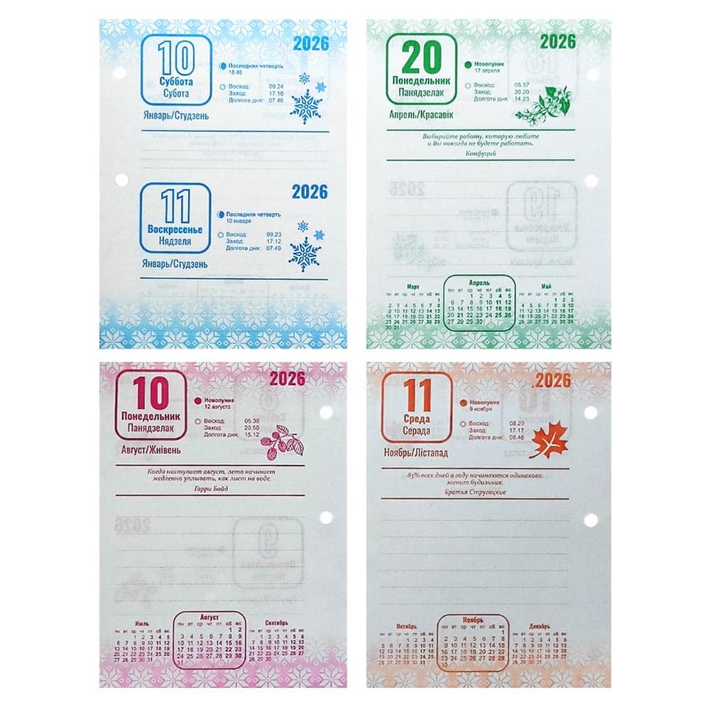 Перекидной настольный календарь на 2026 год — это незаменимый аксессуар для любого, кто ценит свое время. Каждый квартал выделяется своим уникальным цветом текста, что делает календарь еще более привлекательным. Благодаря компактному формату 10,5 х 14 см, этот календарь не займет много места на вашем рабочем столе. Он включает в себя все международные и государственные праздники, а на каждой странице вы найдете календарную сетку на месяц. Также указаны восходы и заходы Солнца и Луны, фазы Луны и множество другой интересной и полезной информации.Боковые отверстия для колец позволяют закрепить календарь на специальной подставке и переворачивать страницы, не отрывая их. Это позволяет сохранять все ваши записи в одном месте и всегда иметь под рукой актуальные данные.