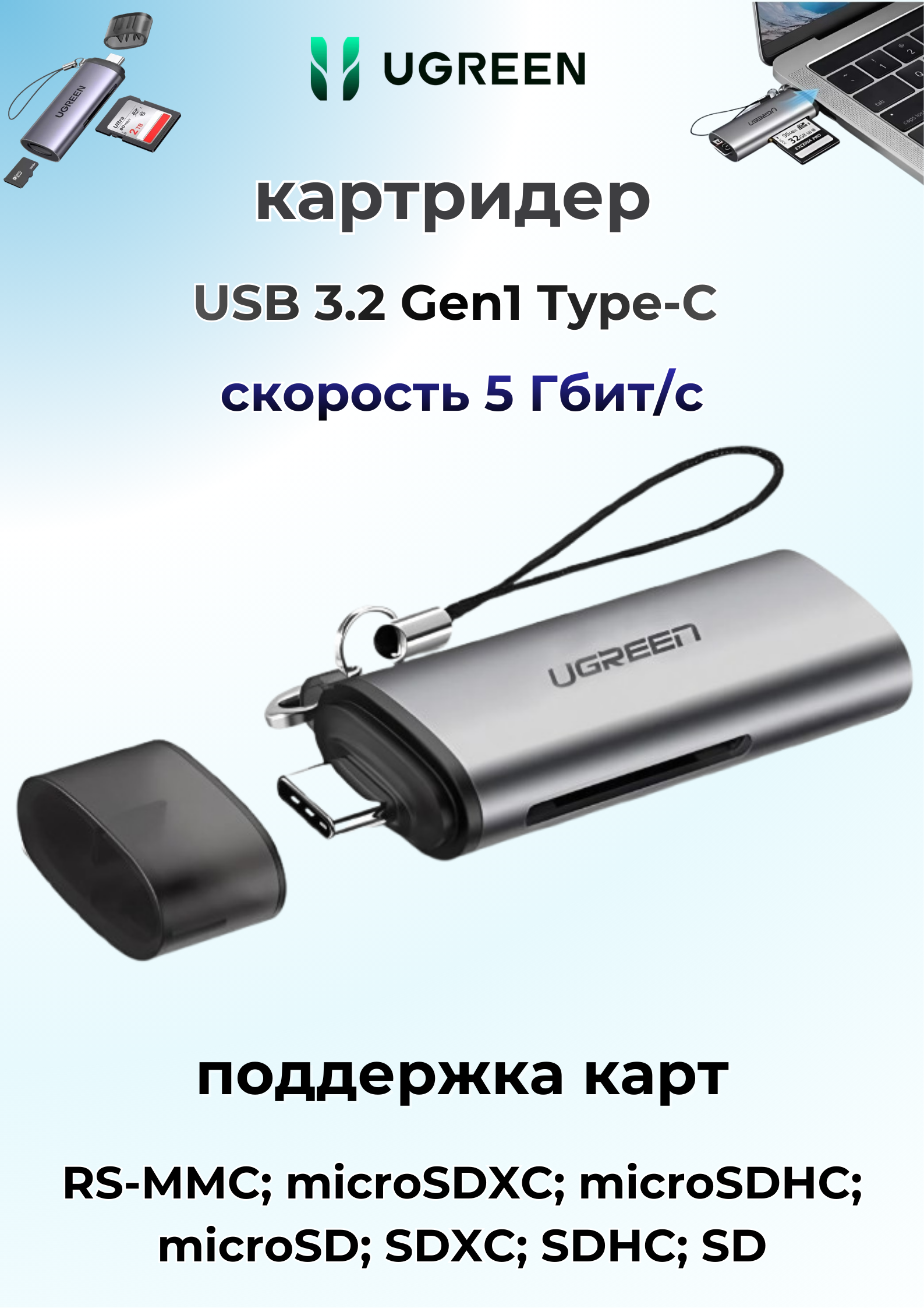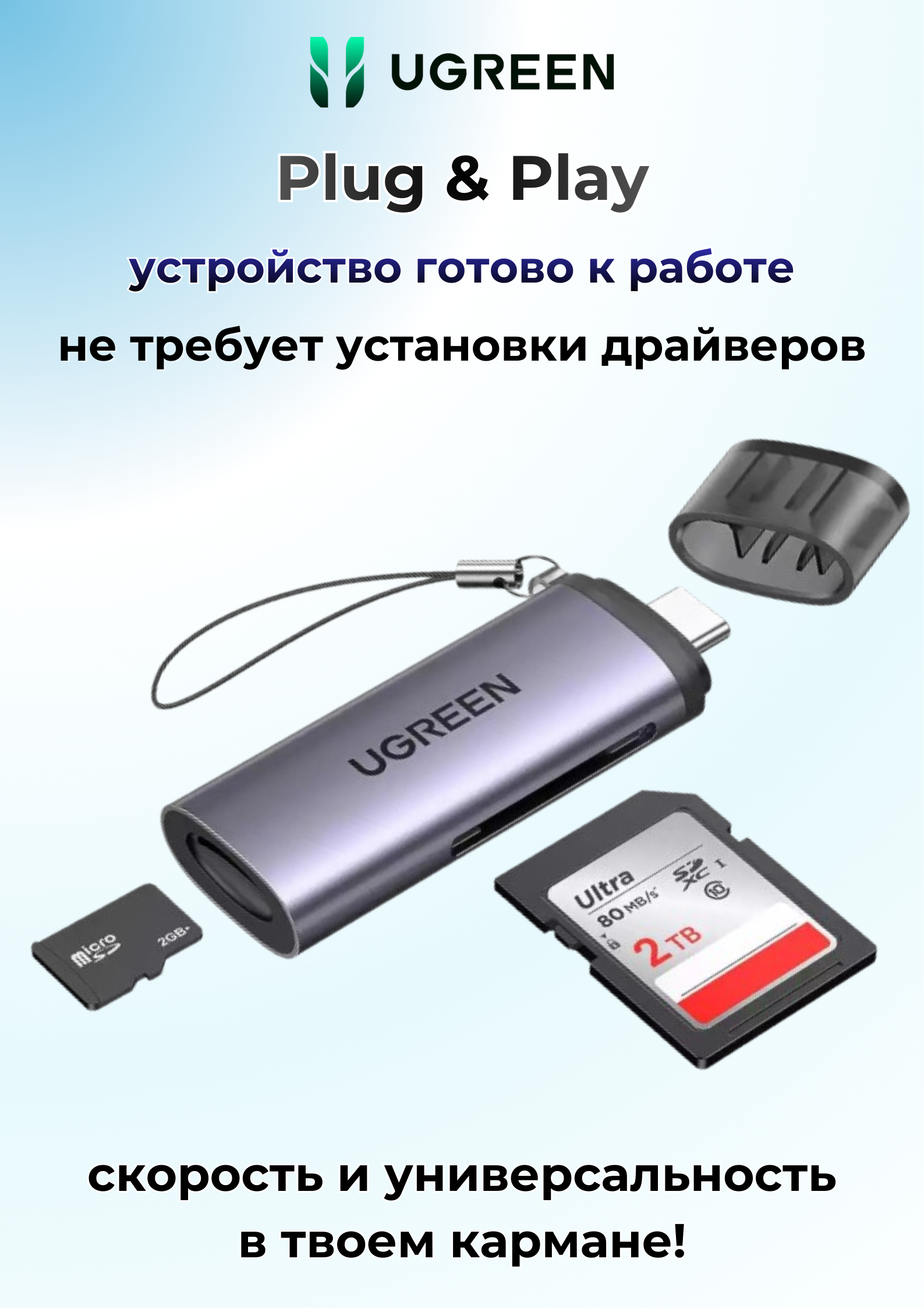 Картридер Ugreen: скорость и универсальность в твоем кармане! Ugreen CM184 — это ваш быстрый мост между картой памяти и техникой. Заказывайте сейчас и оцените разницу в скорости!