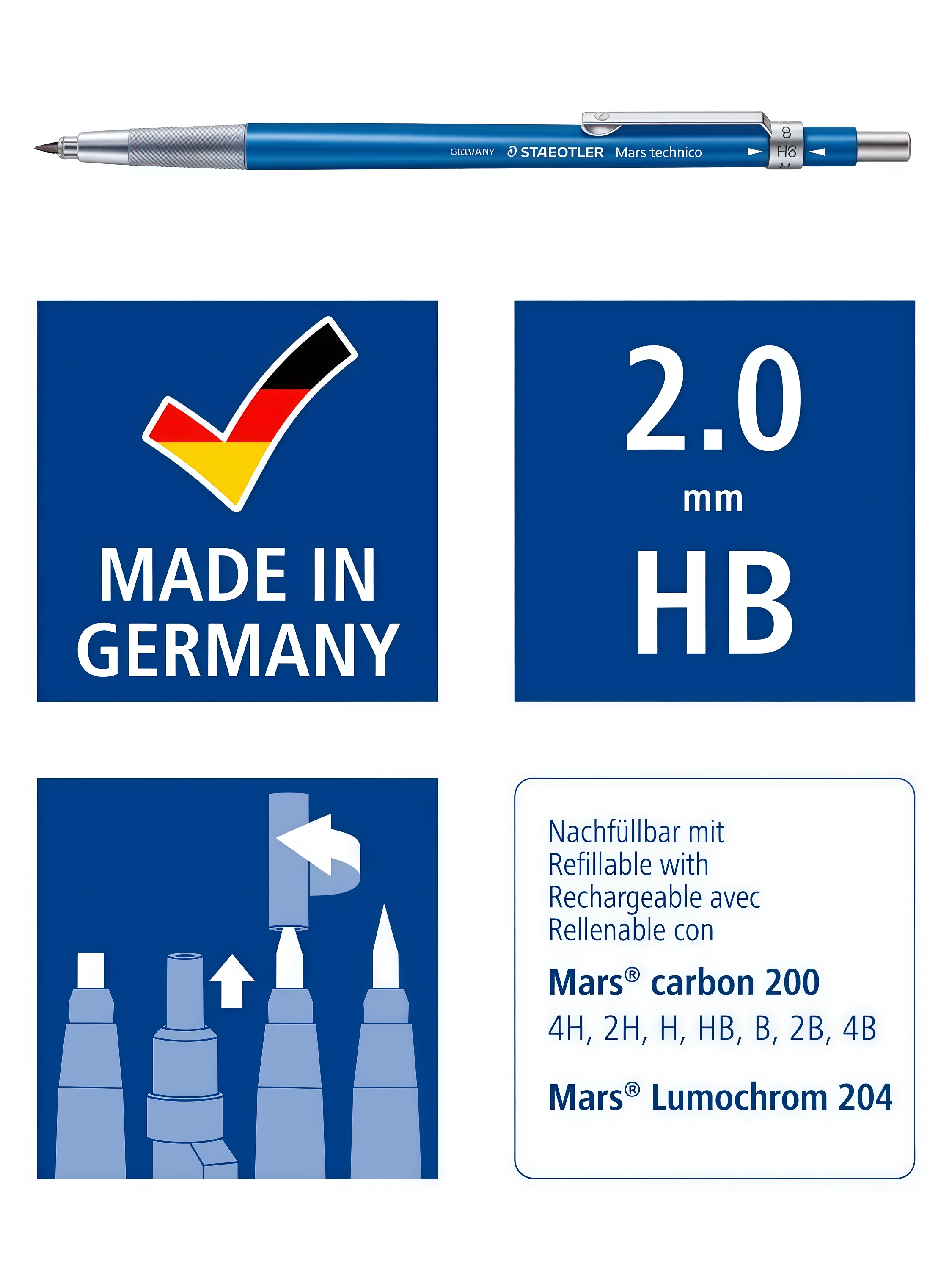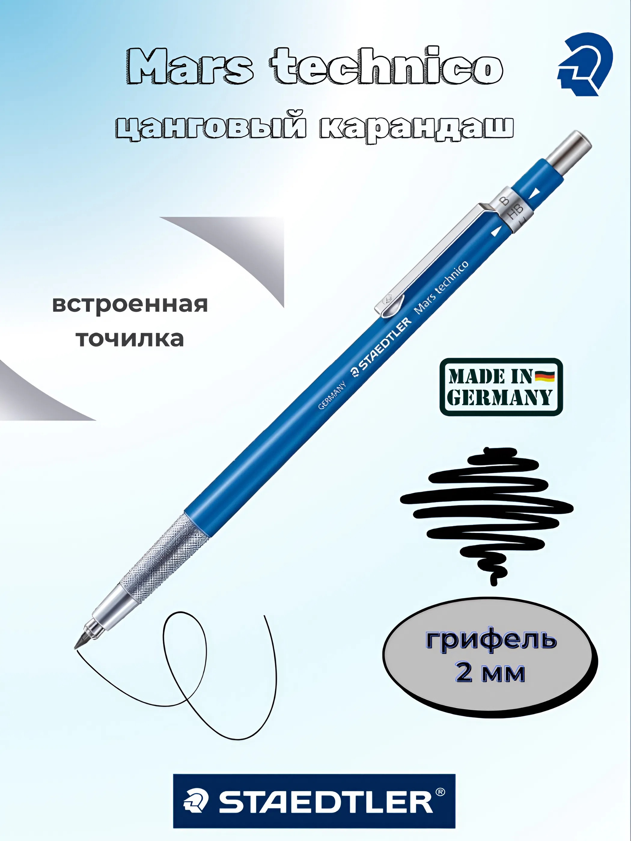 Карандаш механический цанговый STAEDTLER Mars technico с автоматической подачей грифеля и встроенной точилкой в кнопке, диаметр грифеля 2 мм. Цанговый карандаш STAEDTLER Mars technico 2.0 мм — профессиональный инструмент для черчения, технических работ и эскизов. Карандаш широко используется архитекторами, инженерами, дизайнерами и студентами профильных учебных заведений в Беларуси. Надёжный цанговый механизм обеспечивает прочную фиксацию грифеля диаметром 2.0 мм и точную подачу без люфта. Классический корпус серии Mars удобен для длительной работы и позволяет сохранять контроль над линией. Карандаш подходит для использования с грифелями различной твёрдости, что делает его универсальным решением для чертежей, графики и скетчинга. Оригинальная продукция бренда STAEDTLER — немецкое качество и долговечность. Механический карандаш STAEDTLER Mars technico — это эталон надежности и качества для профессионалов в черчении, графике, архитектуре и дизайне. Он создан для тех, кто ценит бескомпромиссную точность и долговечность в каждой линии. Купить цанговый карандаш STAEDTLER Mars technico 2.0 мм можно на tuba.by с оперативной доставкой по Беларуси.