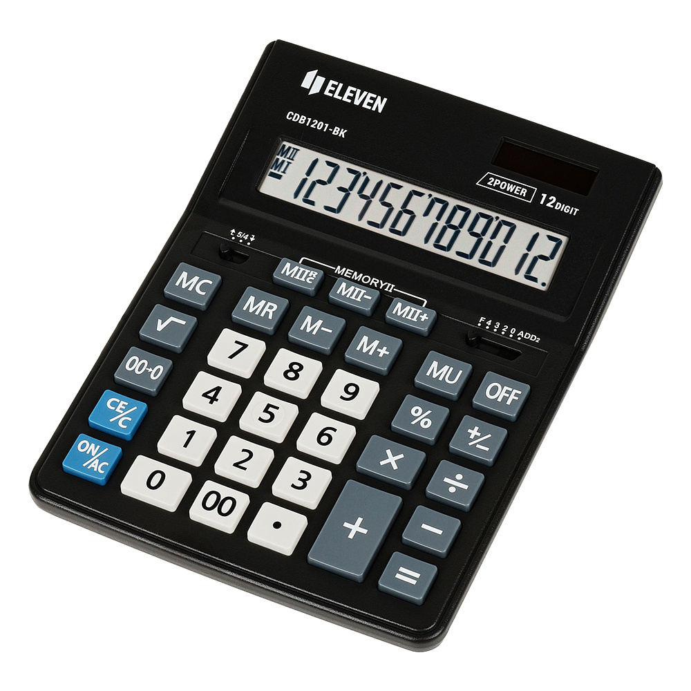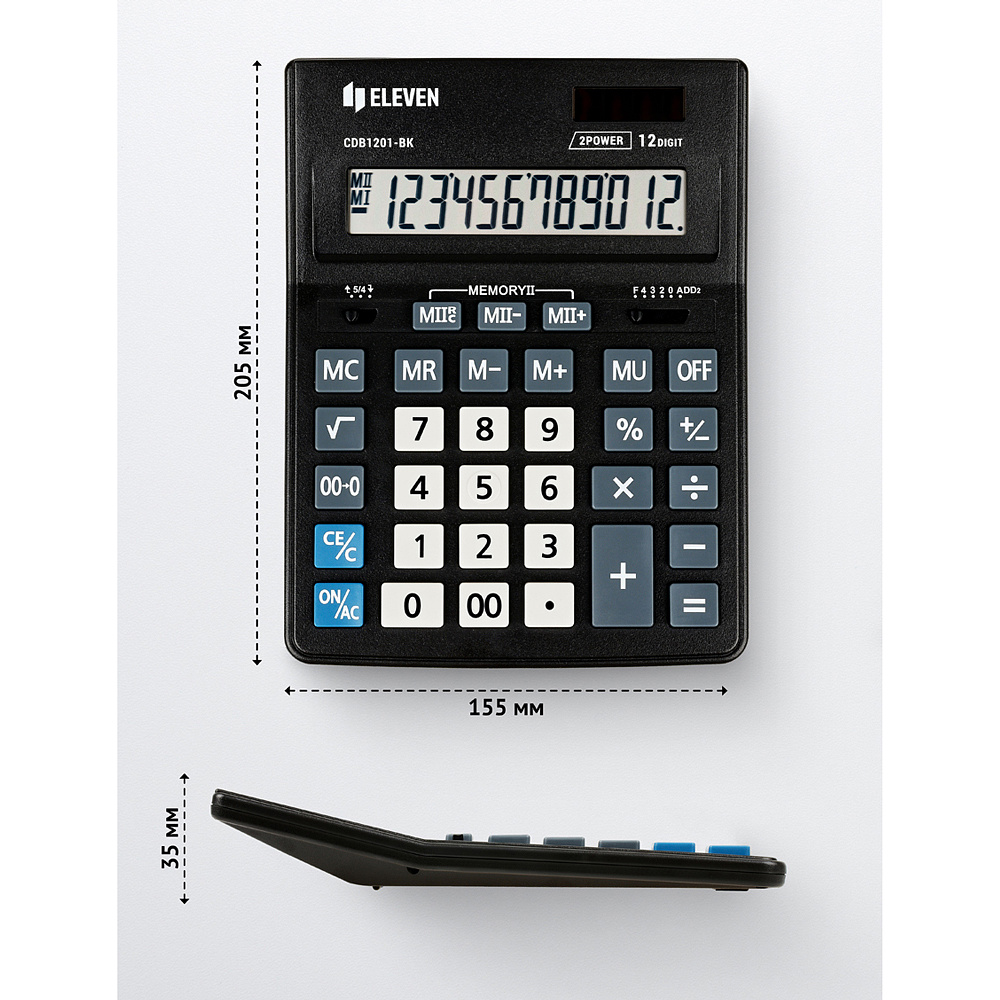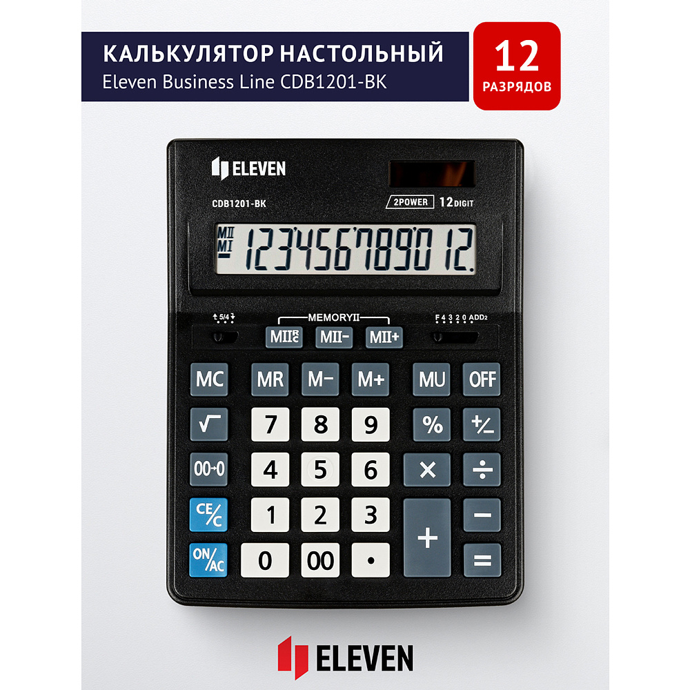 12-разрядный настольный калькулятор Eleven CDB1201-BK — незаменимый инструмент для офиса, школы и дома. Он оснащён оптимальным набором функций, которые позволяют автоматизировать расчёты: вычисление квадратного корня, коррекция последнего введённого значения, кнопка «00», двойная память и расчёт наценки. Двойное питание (солнечная батарея + батарейка AG10 (LR1130)) и автоматическое отключение увеличивают срок службы калькулятора. Его размер — 155x205x35 мм, вес — 200 г, цвет — чёрный. Eleven Business Line — это линейка настольных калькуляторов, предназначенных для ежедневного использования в офисе. Они отличаются эргономичной формой, крупными клавишами и устойчивыми прорезиненными ножками, что позволяет работать более эффективно.