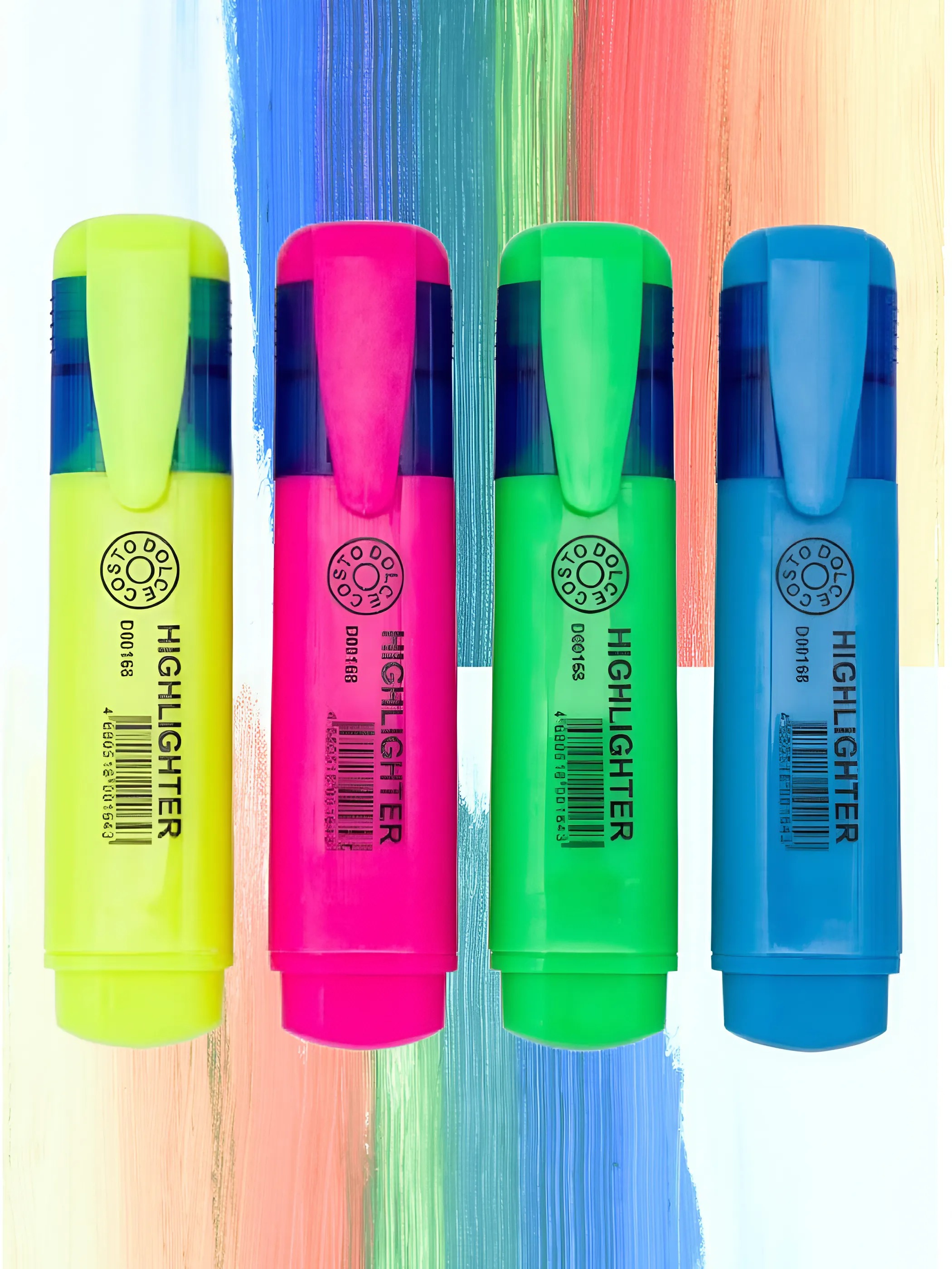 Набор маркеров-текстовыделителей DOLCE COSTO — это яркое и практичное решение для выделения важных фрагментов текста. Они помогут вам эффективно структурировать информацию, акцентировать внимание на ключевых моментах и сделать ваши заметки более заметными и запоминающимися. В комплект входят четыре маркера с уникальными цветами: жёлтый, зелёный, нежно-розовый и голубой. Корпус маркеров выполнен в тон чернил, что позволяет легко отличить их друг от друга и быстро найти нужный цвет. Клиновидный наконечник обеспечивает плавное скольжение по бумаге и позволяет регулировать толщину линии. Вы можете подчеркнуть текст тонкой линией шириной 1 мм или выделить его широкой полосой шириной 5 мм — в зависимости от ваших предпочтений и задач. Чернила на водной основе, нетоксичные и безопасные для детей. В состав входит флюоресцентный пигмент, который придаёт яркость и контрастность, позволяя легко выделить текст на любой бумаге — от обычной офисной до глянцевой фотобумаги и даже картона.